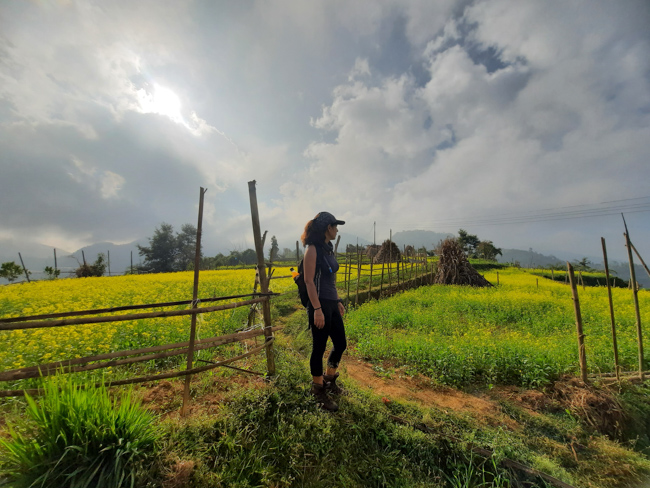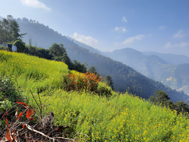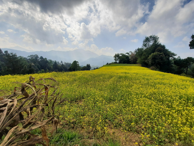 | Yellow mustard fields on rugged terraces, against a backdrop of mountains, villages and temples | |